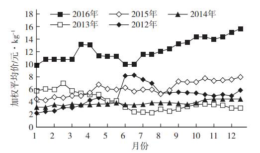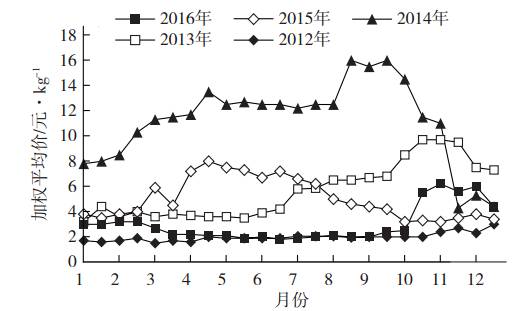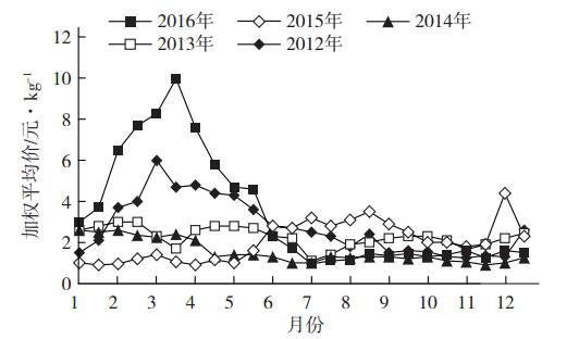 由图2可知,2012年的 2~5 月,大葱卖出了“天价”,随后几年,大葱的价格跌入低谷。特别是2015年春季,福建大葱严重滞销,甚至出现一些葱农需要对前来收购大葱的批发商提供一定补贴的现象:地里的大葱不仅不要钱,批发商如果到地里收购,葱农每亩还要倒贴给批发商200元的雇工补贴。伤农现象比较严重。