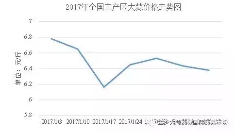 2017年1月上旬大蒜产地均价为6.8元/斤,春节期间,市场上大蒜价格开始趋弱,从年初的6.78元/斤下跌到6.16元/斤。春节过后,大蒜交易渐渐恢复,并迎来新一轮消费高峰期,大蒜价格出现短暂的反弹,但却抵挡不住价格下滑的总趋势。