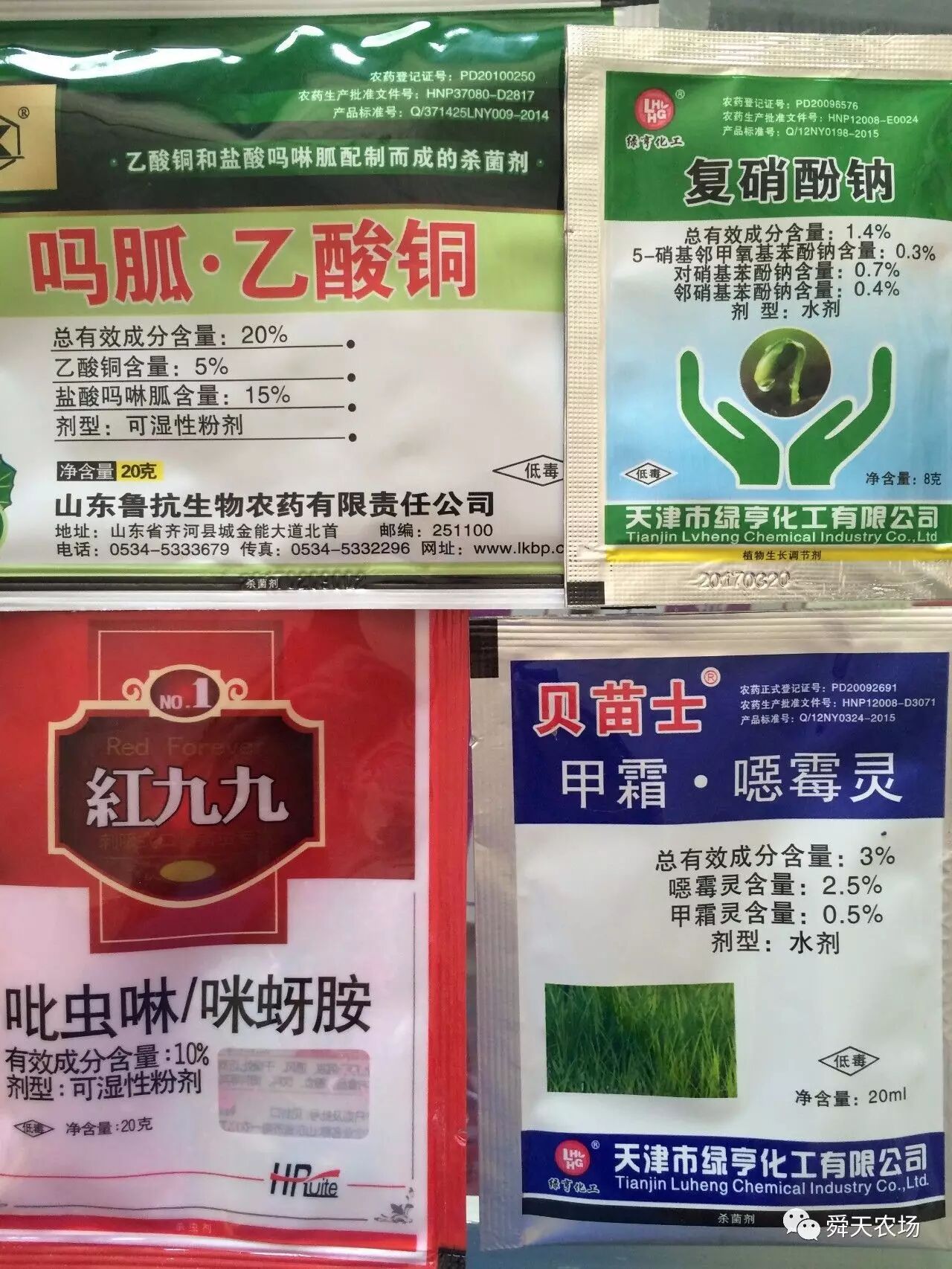 吗胍乙酸铜治疗和预防病毒病;复硝酚钠提根壮苗;吡虫啉咪蚜胺主要预防蚜虫、蓟马、灰飞虱等害虫,病毒病的传播源主要是灰飞虱; 甲霜噁霉灵预防和治疗根部病害。