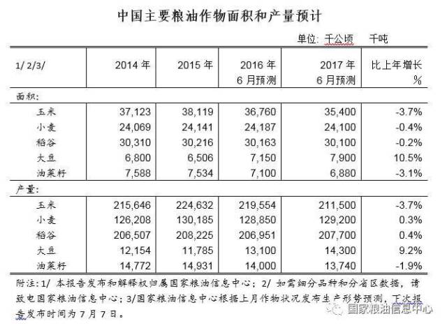 中国农业部公布6月中国农产品供需形势分析报告显示:本月预测,2017/18年度,中国玉米播种面积约35590千公顷,比上月预测数调减250千公顷,产量下降概率极大。主要原因,一是东北春玉米产区遭受干旱和冰雹灾害影响玉米种植,二是河北、河南等夏玉米产区播种面积预期减少。与此相反,今年国内大豆种植面积增长约10。5%,产量约增长9.2%。