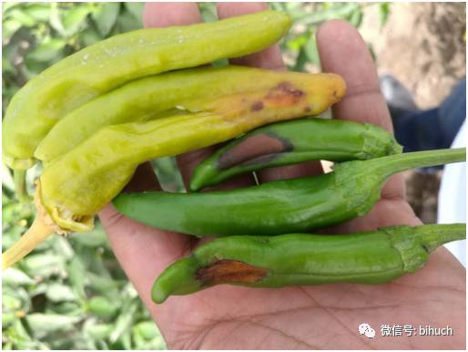 三、生理性病害防治由于受高温天气的影响,辣椒最容易发生日烧病、蒂腐果(脐腐病)和辣椒生理性卷叶。3.1辣椒日烧病:辣椒日烧病是辣椒常发生的一种生理病害。3.2辣椒蒂腐果: 露天栽培的辣椒,在生长发育期常发生蒂腐果也称脐腐病。3.3辣椒生理性卷叶:辣椒叶片纵向上卷呈筒状,变厚、变脆、变硬:有时植株上部,植株生长发育停止,叶柄和叶脉硬化,容易折断,叶片发生扭曲,出现花蕾和叶片脱落。3.4落花落果:高温季节易发生落花落果。防治措施:1、改善田间小气候,增加空气湿度,减轻干热风的危害2、在病害防治的过程中添加海藻酸、钙肥等中微量元素3、在病虫害的防治过程中使用碧护生态综合技术促进药液的吸收和利用,提升植株的抗逆性(抗高温、抗干旱、抗干热风能力)和抗病性。
